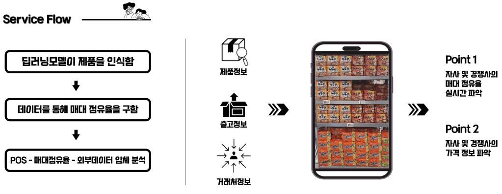 – 실제 판매 매대에 대한 이미지 스캔을 통하여, 제품 인식 및 사물 탑지를 통해 매대별 전체 제품에 대하여
