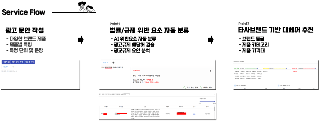 마케터들의 광고문안 작성 시 법률/규제검토 시간단축 및 효율화를 위해 자동검토해주고, 위반 가능성이 높을 시에 대체어 추천해주는 솔루션
