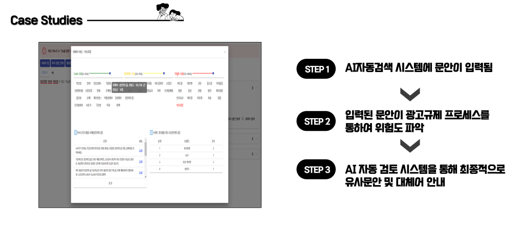 – 블로그, 유튜브, 제품상세 안내 등 다양한 분야에서의 제품 홍보 문구들에 대하여, 실제 법적 규제가 존재하거나 실증 요인 및 위반 요소를 AI를 통해 다각적으로 분석하여 정확하고 편리하게 안내